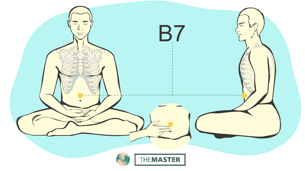 B7 คือ ชีพจร หรือ ลมภายใน อันเป็นลมหายใจที่ละเอียด เป็นจุดปัจจุบันที่ตั้งอยู่เหนือสะดือขึ้นมา 2 นิ้วมือของแต่ละคน มีพิกัดอยู่ในแนวดิ่ง หรือ อยู่ใต้ประตู อยู่ถัดลงมาต่อจาก B6